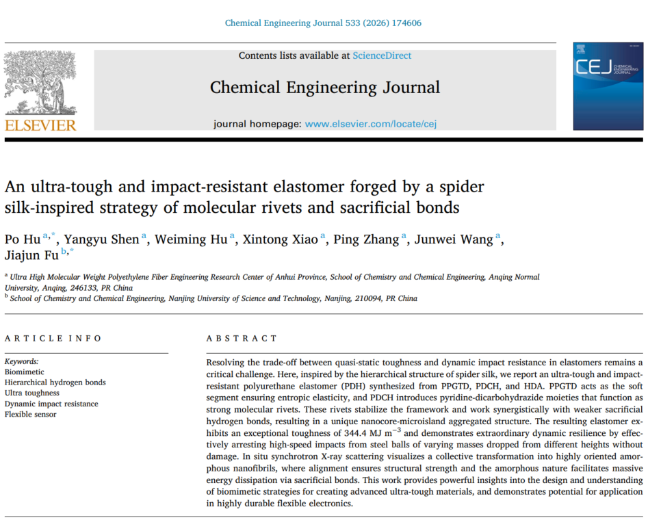 近日,bevictor伟德官网胡珀博士在国际知名期刊《Chemical Engineering Journal》发表题为“An ultra-tough and impact-resistant elastomer forged by a spider silk-inspired strategy of molecular rivets and sacrificial bonds”的研究论文。胡珀博士为论文第一作者,伟德中国官网为该论文第一单位和通讯作者单位,南京理工大学为共同通讯作者所在单位。该期刊为JCR 一区、中科院一区 TOP 期刊,影响因子13.2。