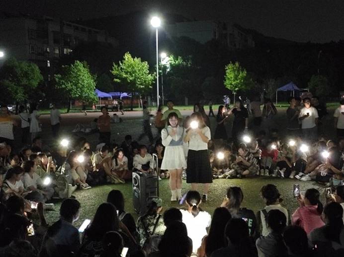 为增进新生之间相互了解,公司在操场上搭建了才艺表演舞台。2021级的新生们能歌善舞,在广阔之地展现着属于他们自己的青春与活力。随着歌曲《夜空中最亮的星》前奏的响起,员工们自发打开手机闪光灯,随着音乐轻轻晃动,沉浸在欢快愉悦的氛围当中。