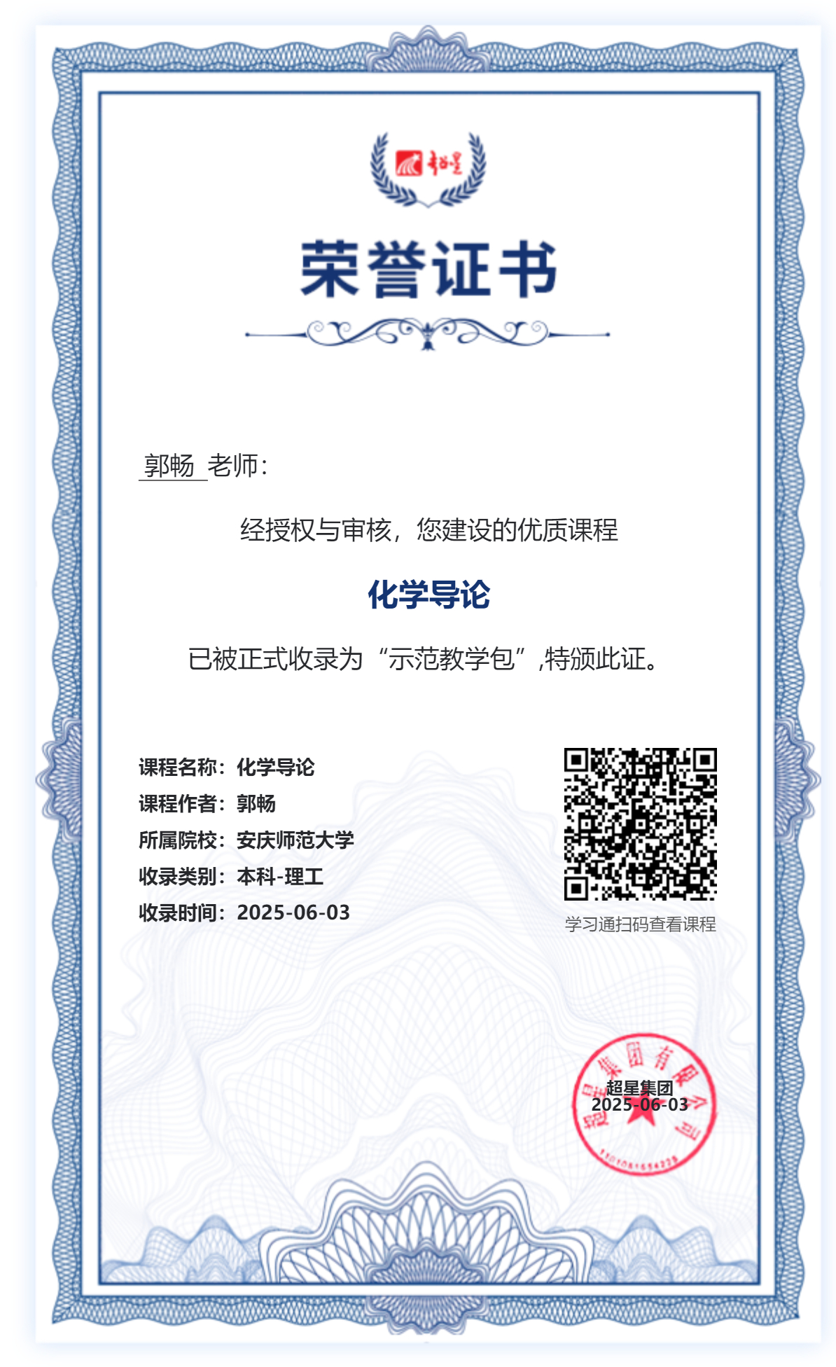 近日,安徽省教科文卫体系统职工创新工作室主持人、bevictor伟德官网郭畅教授主持建设的共享课程资源《化学导论》,经超星集团有限公司严格审核与授权,正式收录为本科理工类“示范教学包”。该课程资源是2023年获评的安徽省省级课程思政示范课,是郭畅职工创新工作室的重要建设成果,也是公司基础课程持续改革创新的重要成果,亦是郭畅教授继《物理化学(1)(2)》在线课程后,第二门获评超星“示范教学包”的课程,标志着公司在推动优质课程资源共享与教学模式创新方面取得的又一标志性进展。