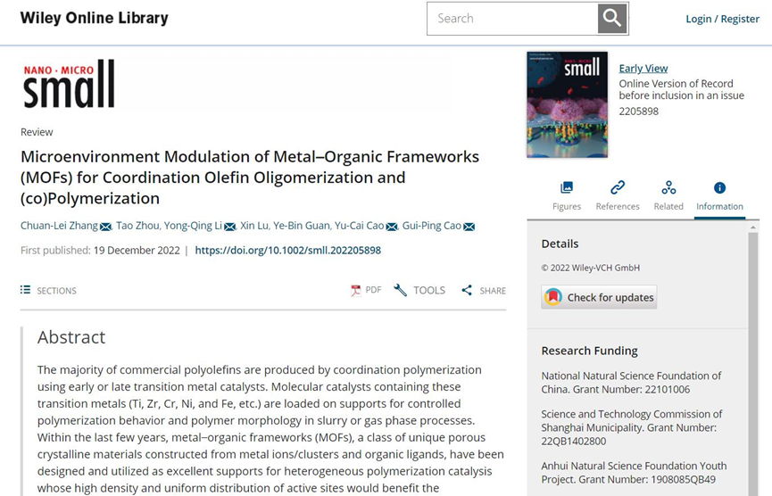 近日,公司bevictor伟德官网张传磊博士课题组在材料领域权威期刊Small (IF=15.153)上发表了题为《Microenvironment Modulation of Metal–Organic Frameworks (MOFs) for Coordination Olefin Oligomerization and (co)Polymerization》的综述性论文。这是公司首次在该top期刊发表学术论文,也是公司在配位聚合催化领域取得的突破性进展,极大地提高了公司在化学学术研究领域的影响力。张传磊为论文第一作者和通讯作者,公司2020级硕士研究生周涛为论文第二作者,伟德中国官网为第一署名单位。
